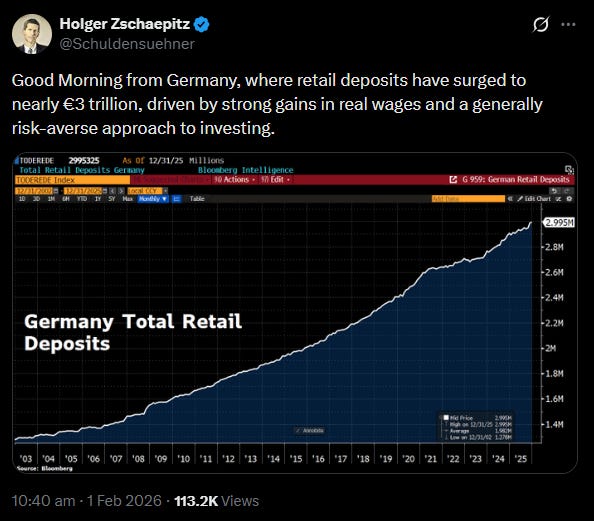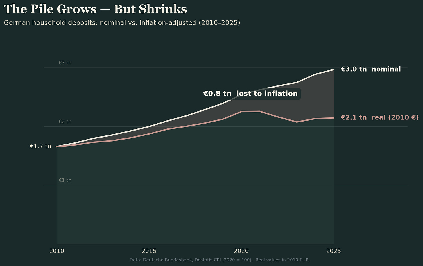 And worst of all, it’s not even growing in real terms. At the end of 2010, German households held €1.7 trillion in deposits. By end of 2025, nearly €3 trillion. That’s 79% nominal growth, which sounds healthy until you subtract 38% cumulative inflation.