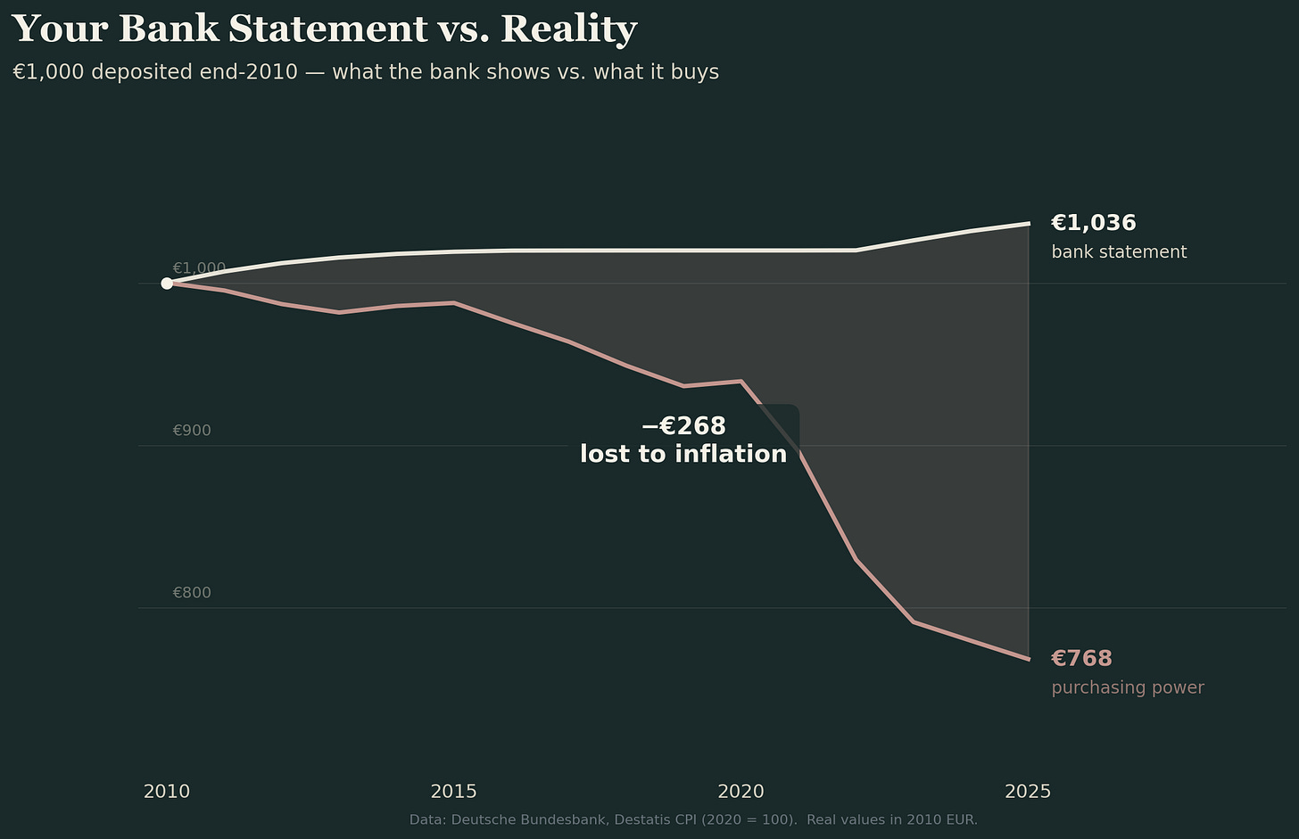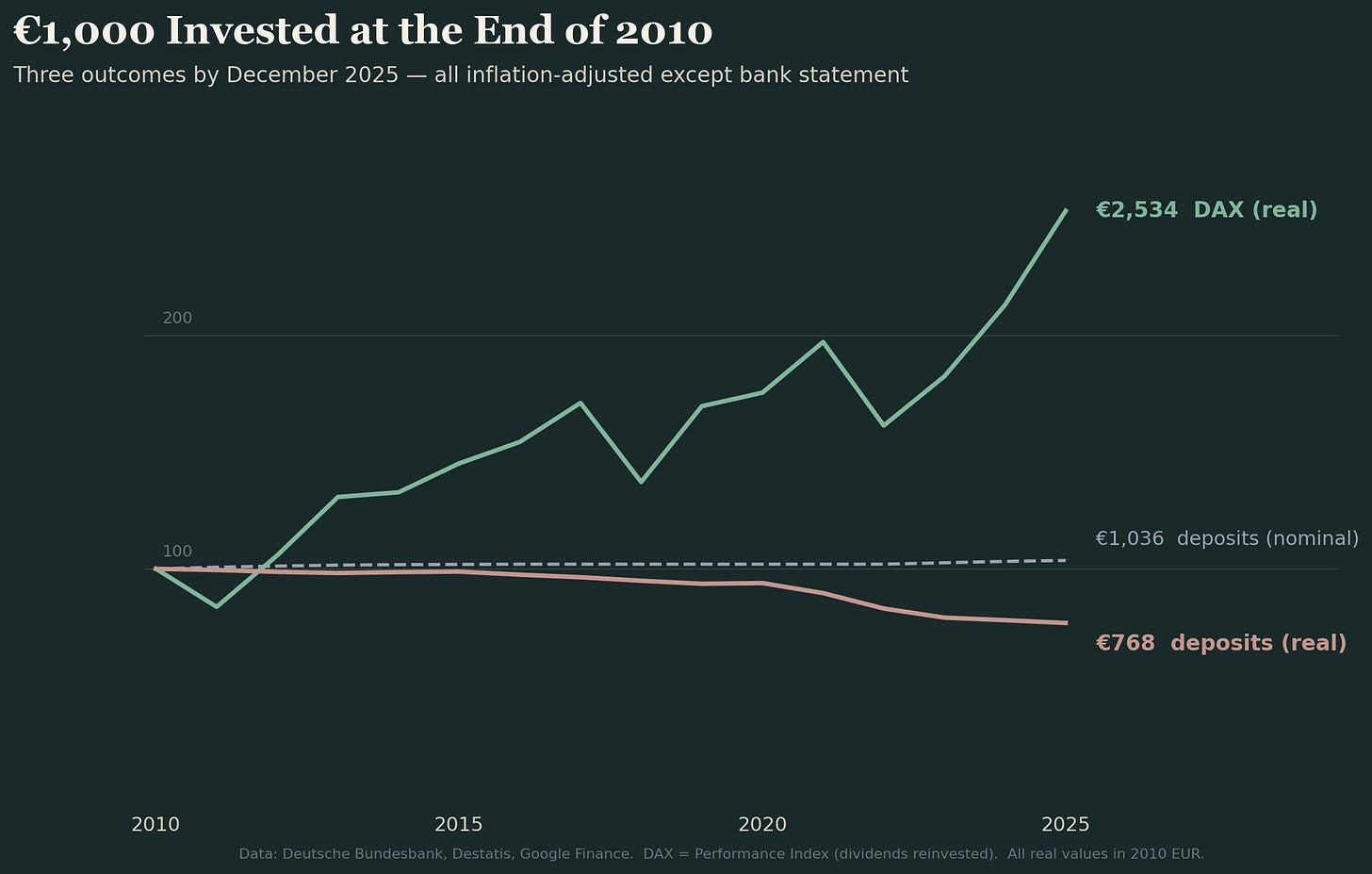 Take €1,000 deposited at a German Sparkasse at the end of 2010. Average deposit rates since then have hovered around 0.3–0.5%. By December 2025, that €1,000 has become roughly €1,036 nominally.