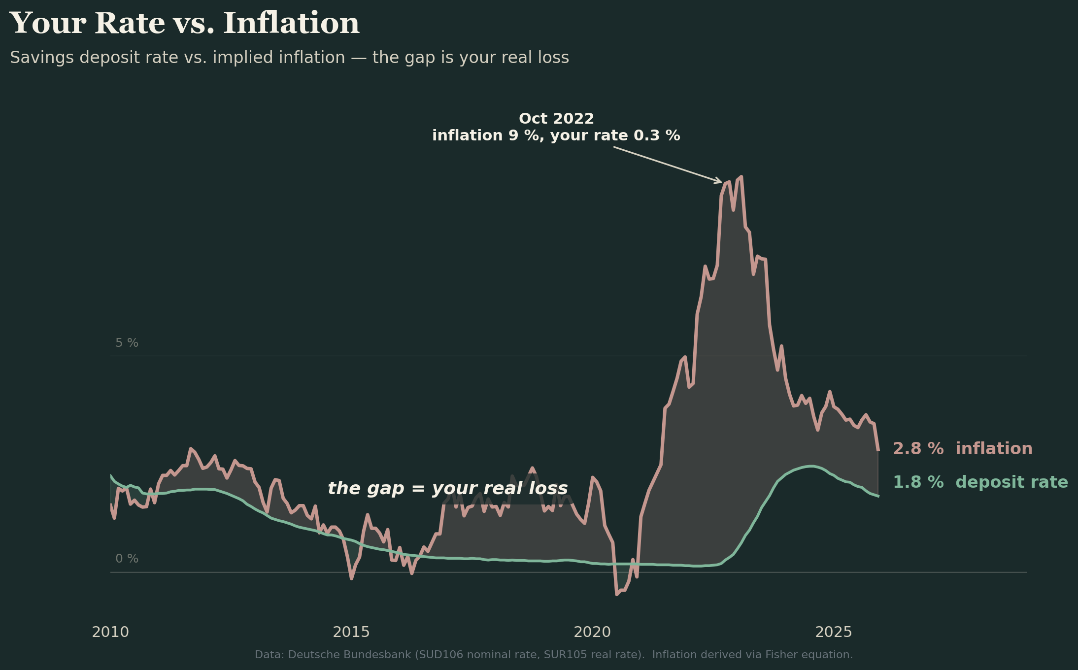 Peak pain was October 2022, when real deposit rates hit −7.99%. Your money was evaporating at nearly 8% a year in purchasing power terms.