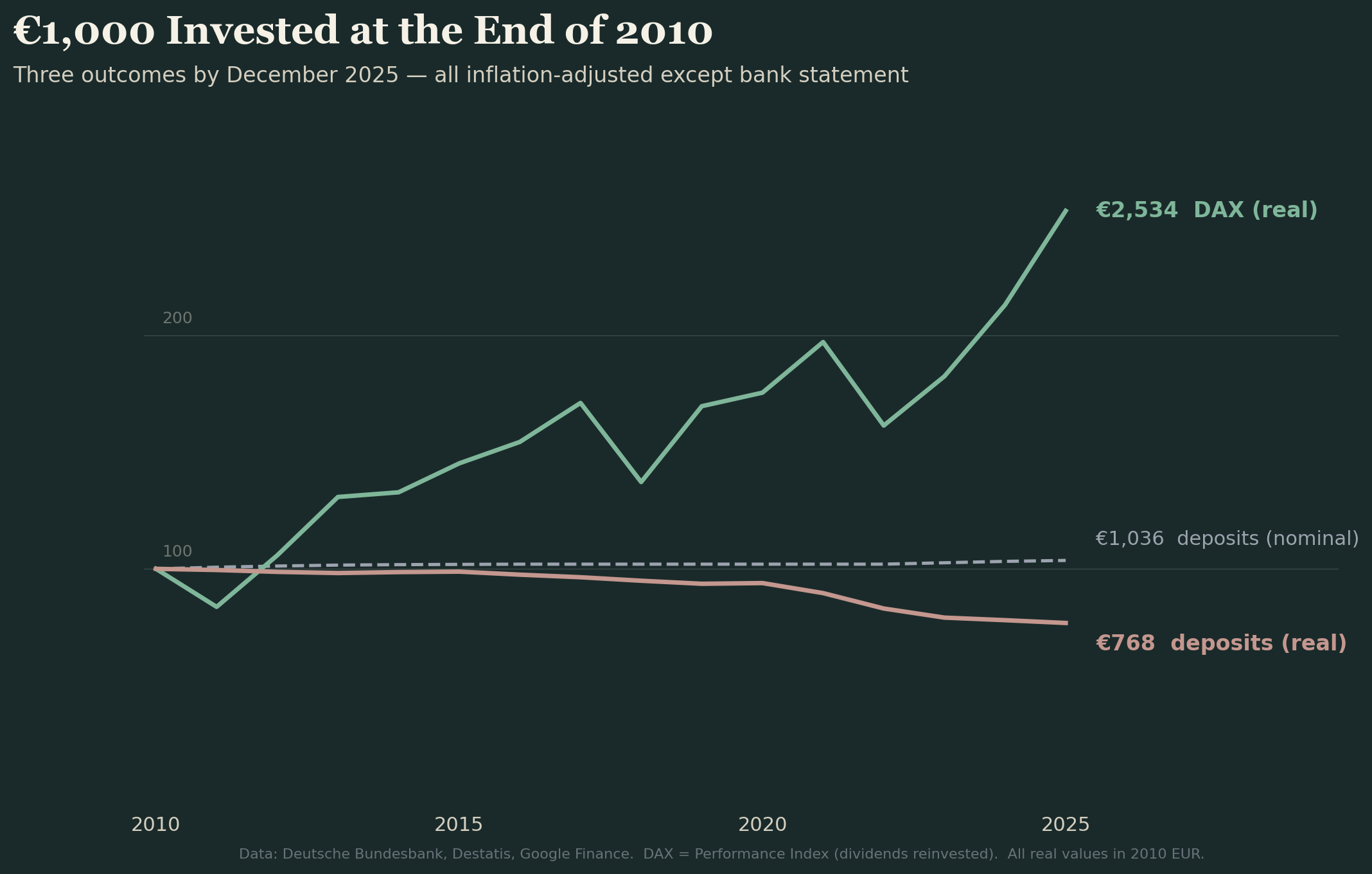 That same €1,000 in the DAX — not crypto, not meme stocks, but Siemens, SAP, Allianz — would be worth €2,534 in real purchasing power today. More than 2.5x your original investment, even after inflation. The “risky” option was German industry. The “safe” option was guaranteed wealth destruction.